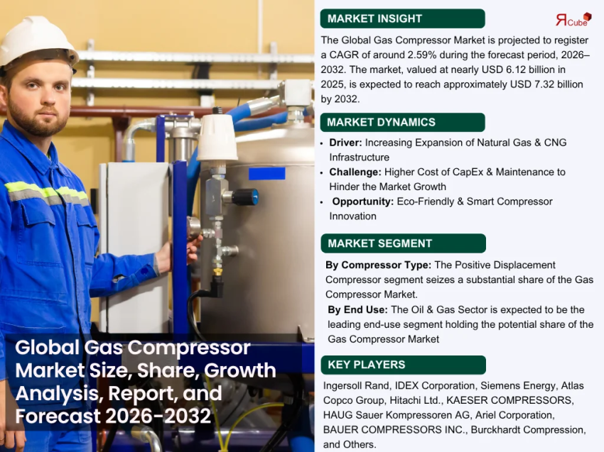The Gas Compressor Market is projected to register a CAGR of around 2.59% during the forecast period, 2026–2032. The market, valued at nearly USD 6.12 billion in 2025, is expected to reach approximately USD 7.32 billion by 2032. The market growth is supported by increasing energy demand, growing pipeline infrastructure, and development in sectors like petrochemicals, oil & gas, and power generation.