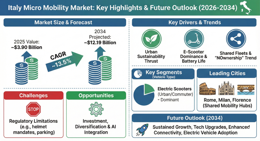 The Italy Micro Mobility Market is projected to expand at a CAGR of 13.5% from 2026 to 2034, Market value is expected to reach about USD 12.19 billion by 2034 form being USD 3.90 billion in 2025.