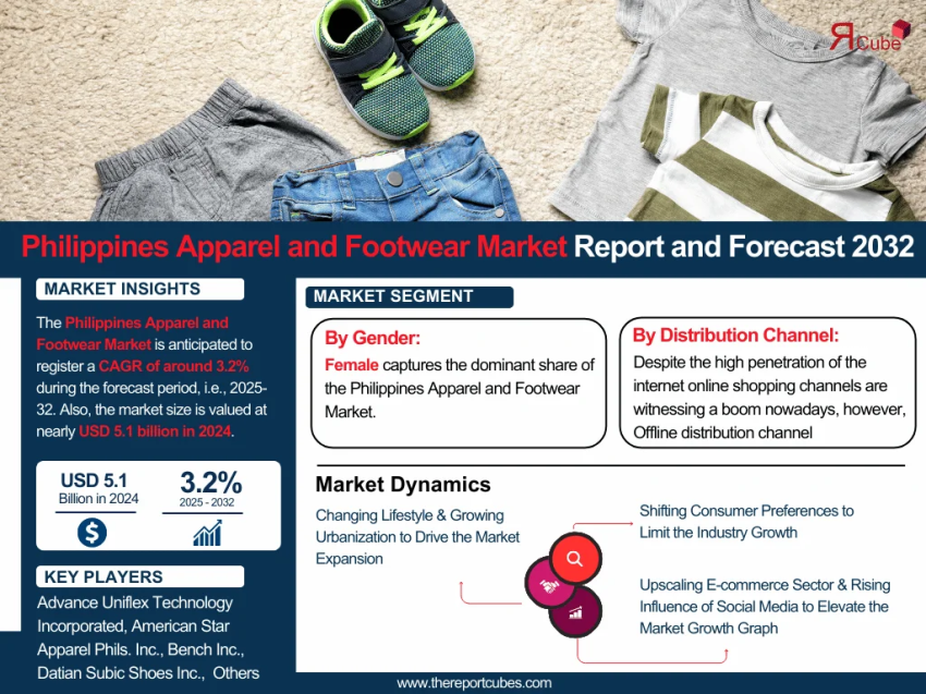 The Philippines Apparel and Footwear Market is anticipated to register a CAGR of around 3.2% during the forecast period, i.e., 2025-32. Also, the market size is valued at nearly USD 5.1 billion in 2024.