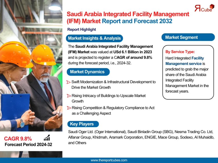 The Saudi Arabia Integrated Facility Management (IFM) Market was valued at USD 6.1 Billion in 2023 and is projected to register a CAGR of around 9.8% during the forecast period, i.e., 2024-32.