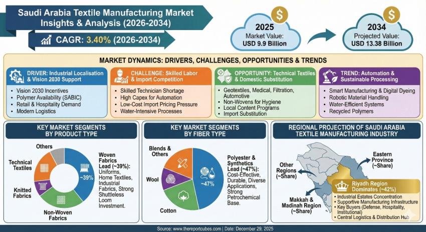The Saudi Arabia Textile Manufacturing Market is projected to grow at a 3.40% CAGR during 2026-2034. The market stood at USD 9.9 billion in 2025 and is expected to reach USD 13.38 billion by 2034